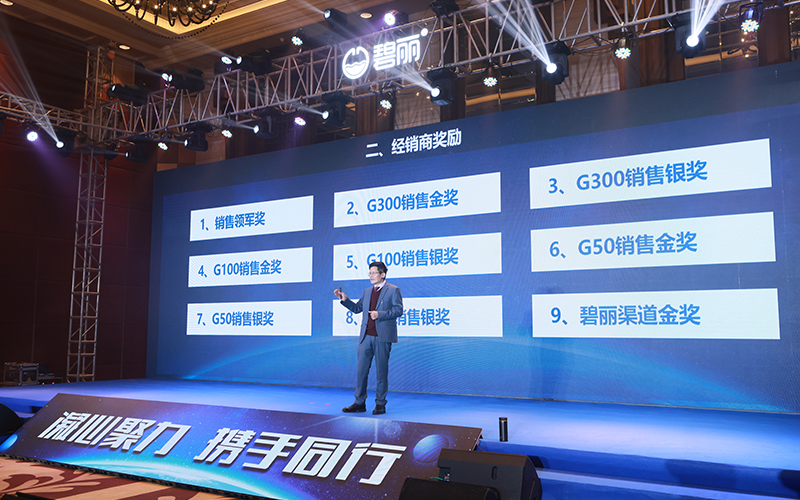 為了回報(bào)各位碧麗家人,答謝廣大終端客戶,2023年碧麗將以更為優(yōu)質(zhì)的產(chǎn)品、心動的政策感謝大家的支持,激勵各位經(jīng)銷商伙伴不斷前進(jìn)。峰會上,碧麗集團(tuán)公布了2023年?duì)I銷政策、激勵政策、電商政策,表彰了"銷售冠軍獎"、"銷售領(lǐng)軍獎"、"G100銷售金獎"、"G100銷售銀獎"等多個(gè)獎項(xiàng),并頒發(fā)了獎牌、豪華獎品以資鼓勵,真正的為經(jīng)銷商帶來了看得見的實(shí)惠。