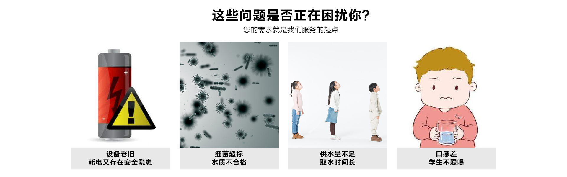 不同的飲水點(diǎn)可根據(jù)實(shí)際使用情況,安裝管線機(jī)或飲水設(shè)備或開(kāi)水器,使用戶能喝上開(kāi)水、溫開(kāi)水、純凈水等,來(lái)滿足不同場(chǎng)景的飲水需求;