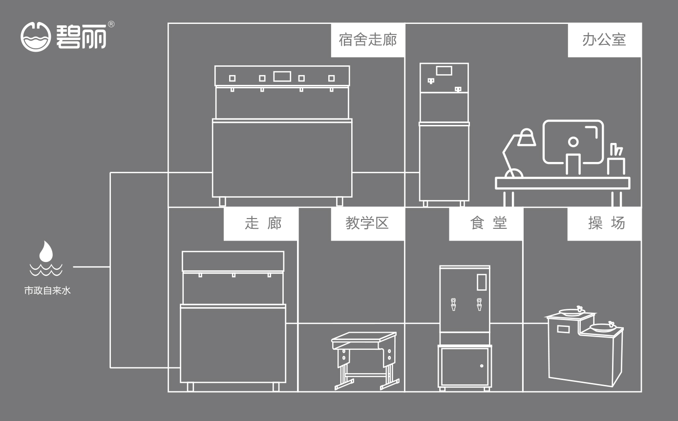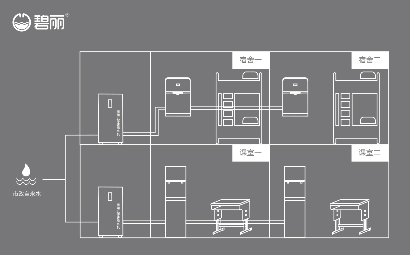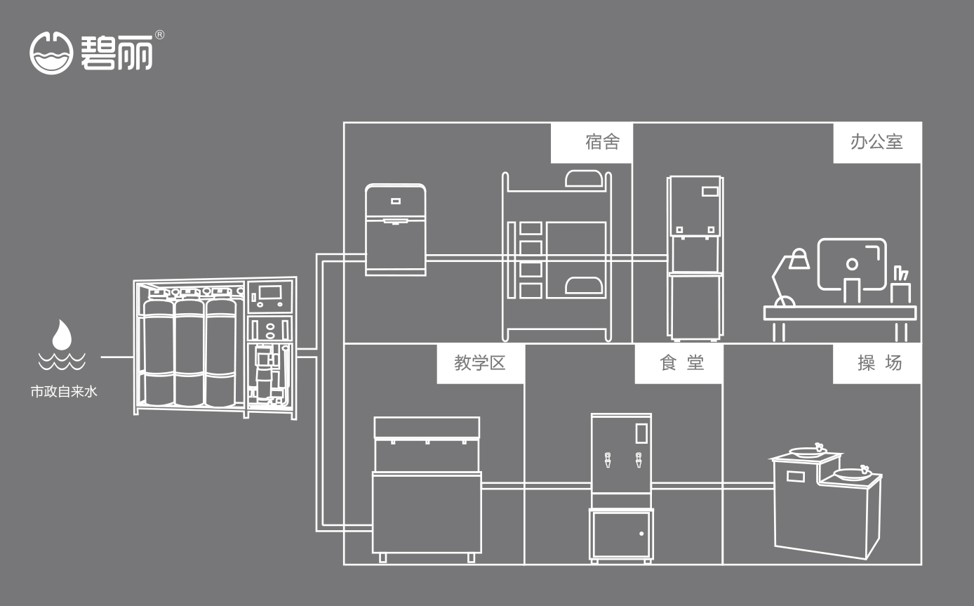 碧麗商用反滲透純水機(jī)將自來(lái)水集中處理后,把優(yōu)質(zhì)的純凈水通過(guò)專用的供水管道輸送到各飲水點(diǎn);