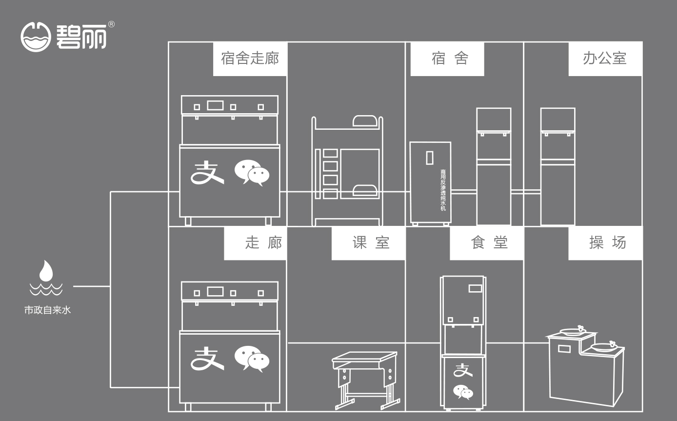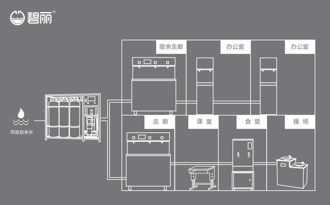 碧麗大型反滲透純水設(shè)備將自來水集中處理后,把優(yōu)質(zhì)的純凈水通過專用的供水管道輸送到各飲水點;