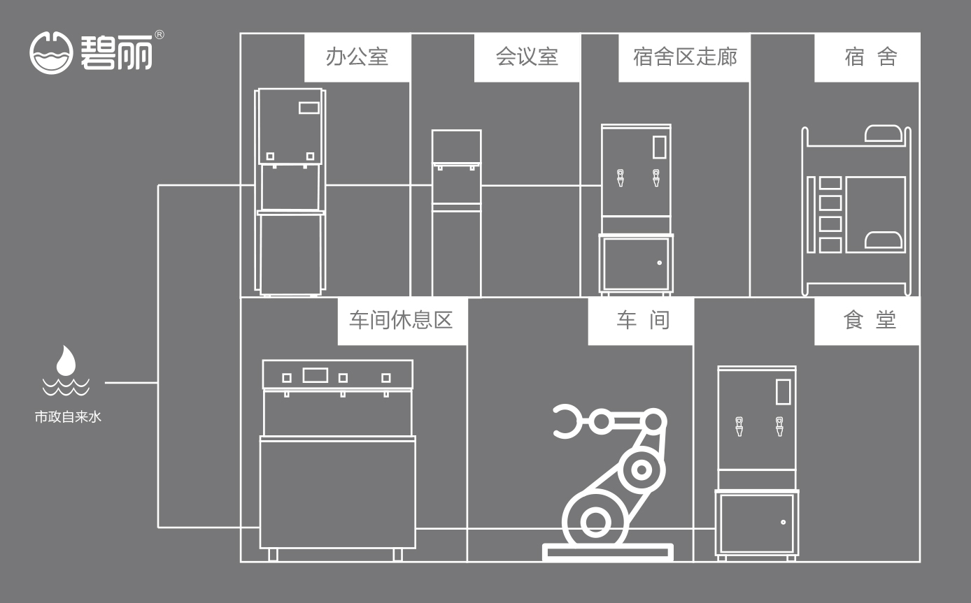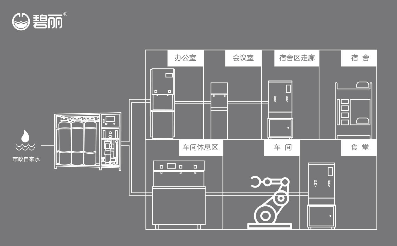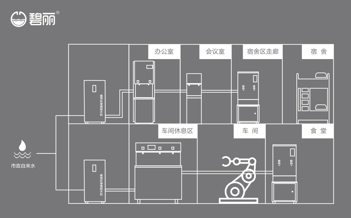 碧麗商用反滲透純水機(jī)將自來水集中處理后,把優(yōu)質(zhì)的純凈水通過專用的供水管道輸送到各飲水點;