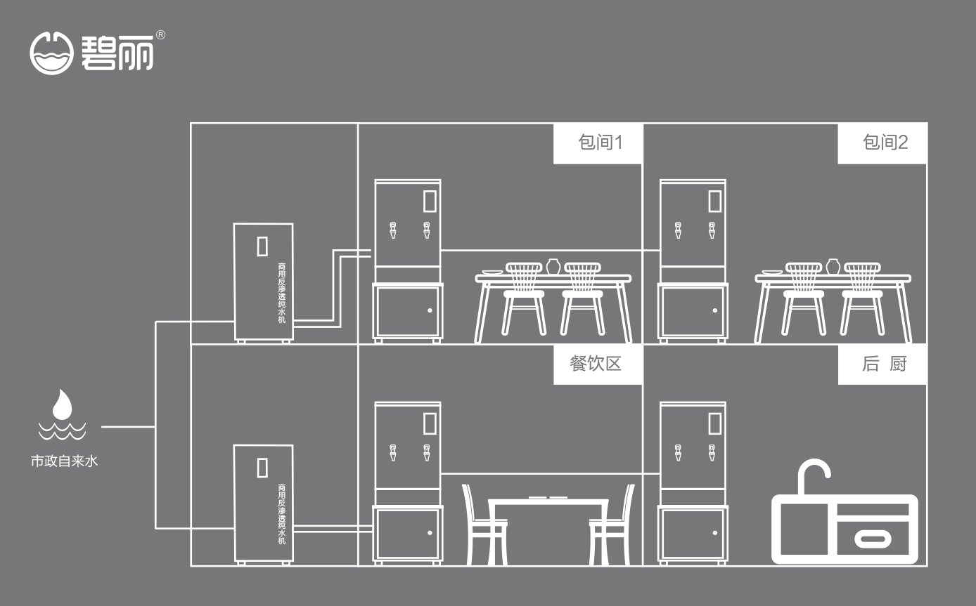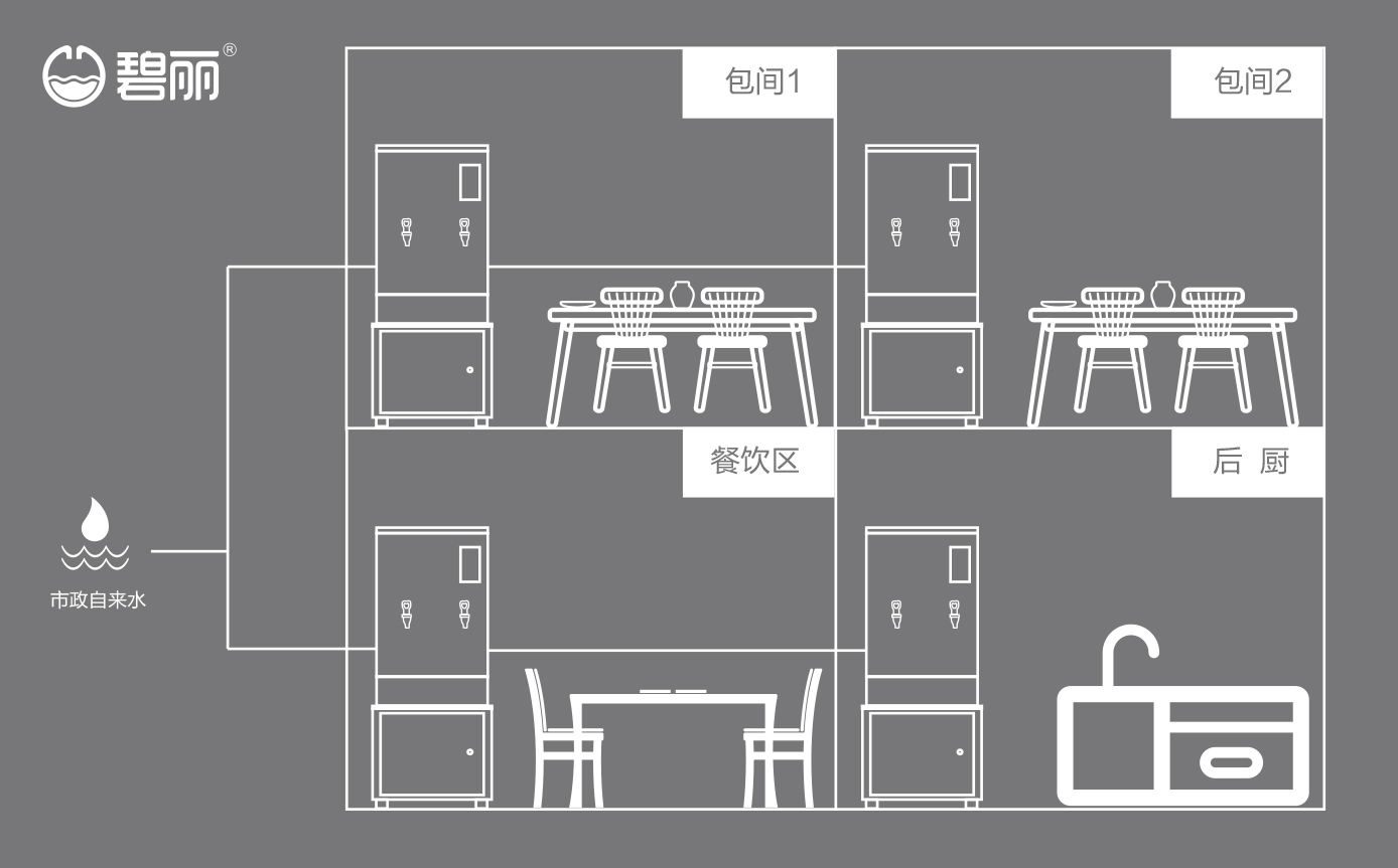 碧麗商用反滲透純水機(jī)將自來(lái)水集中處理后,把優(yōu)質(zhì)的純凈水通過(guò)專(zhuān)用的供水管道輸送到各飲水點(diǎn);
